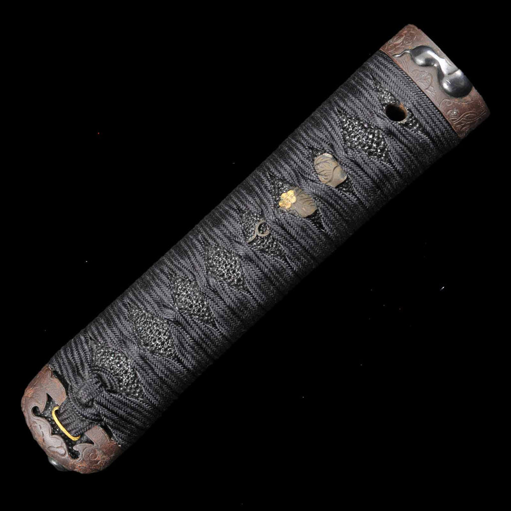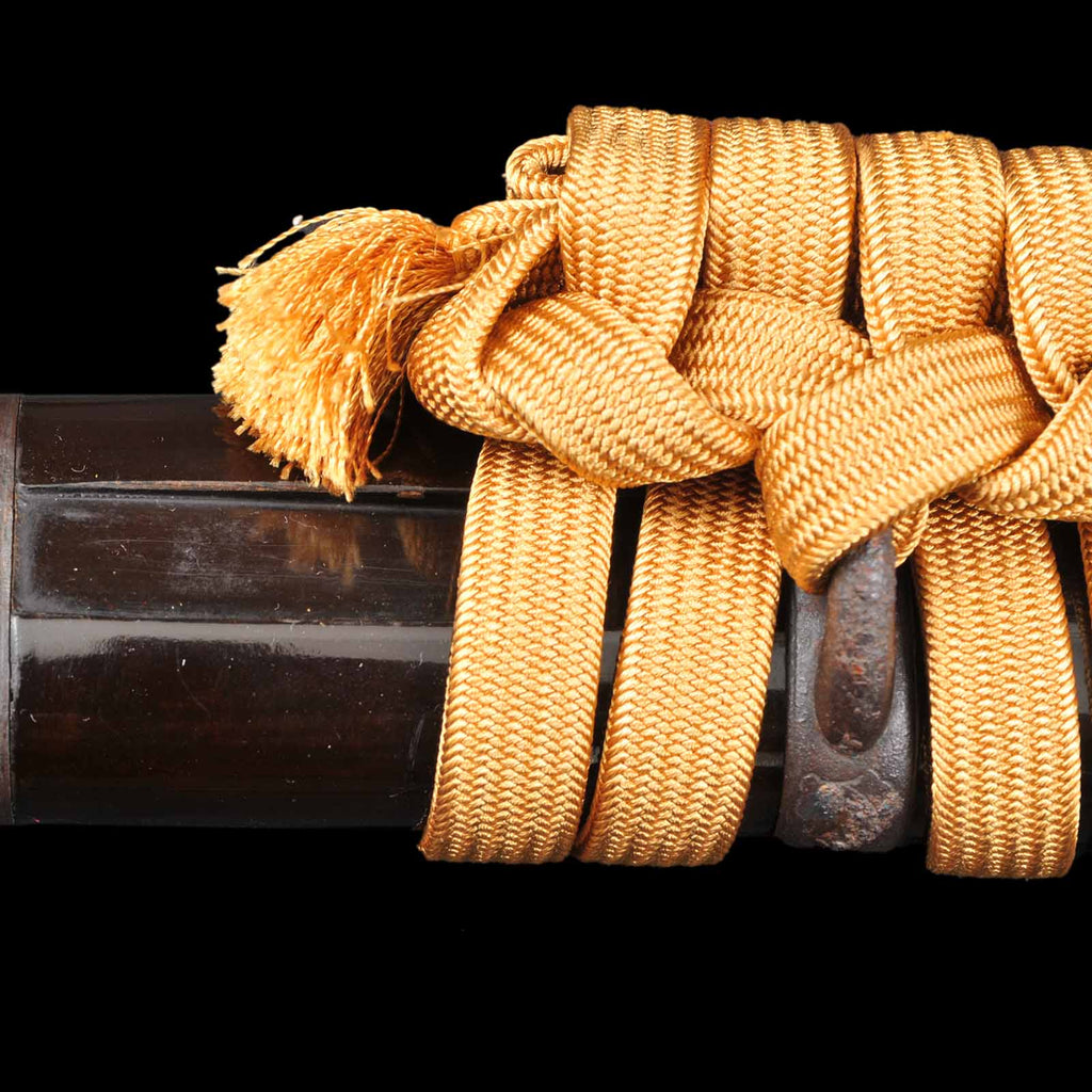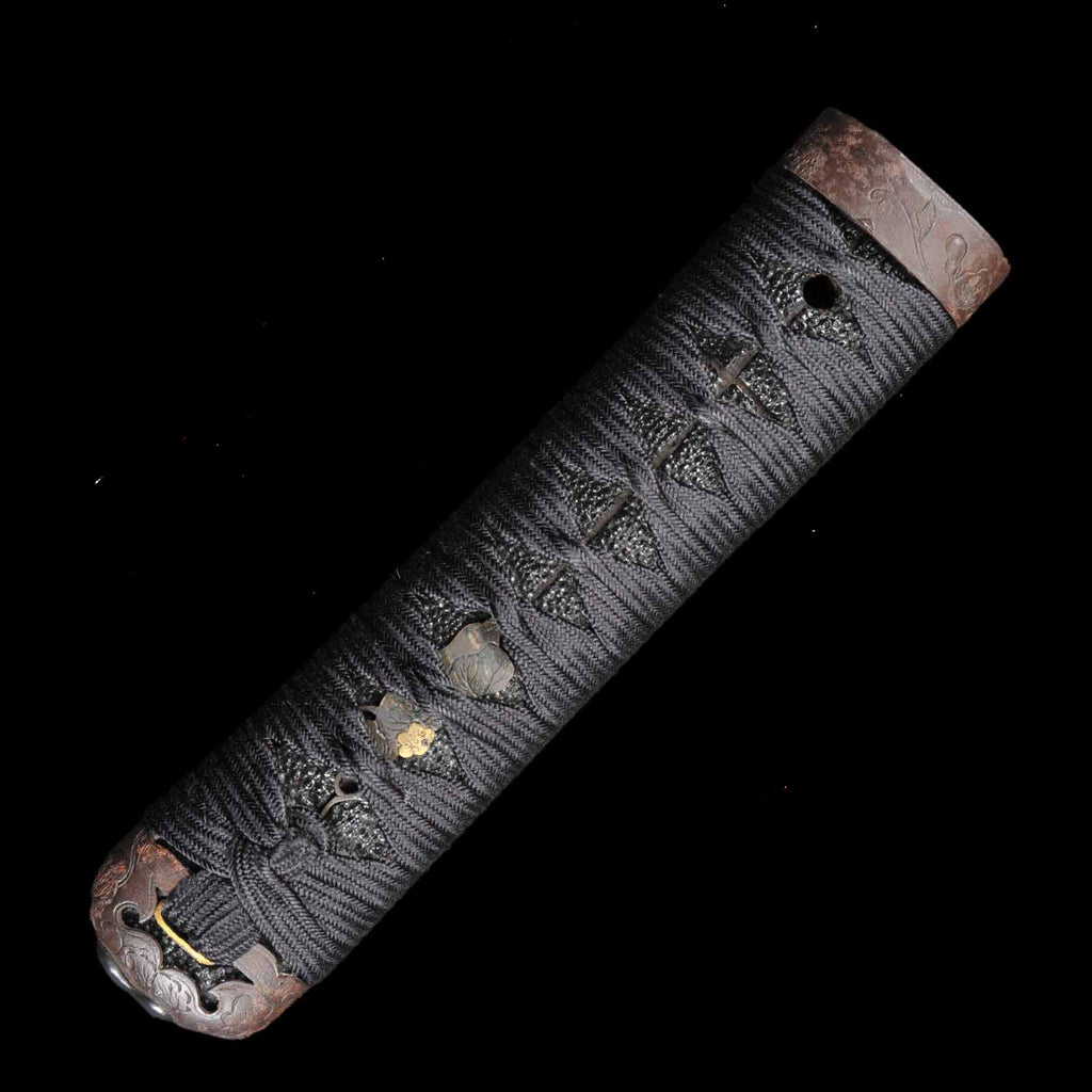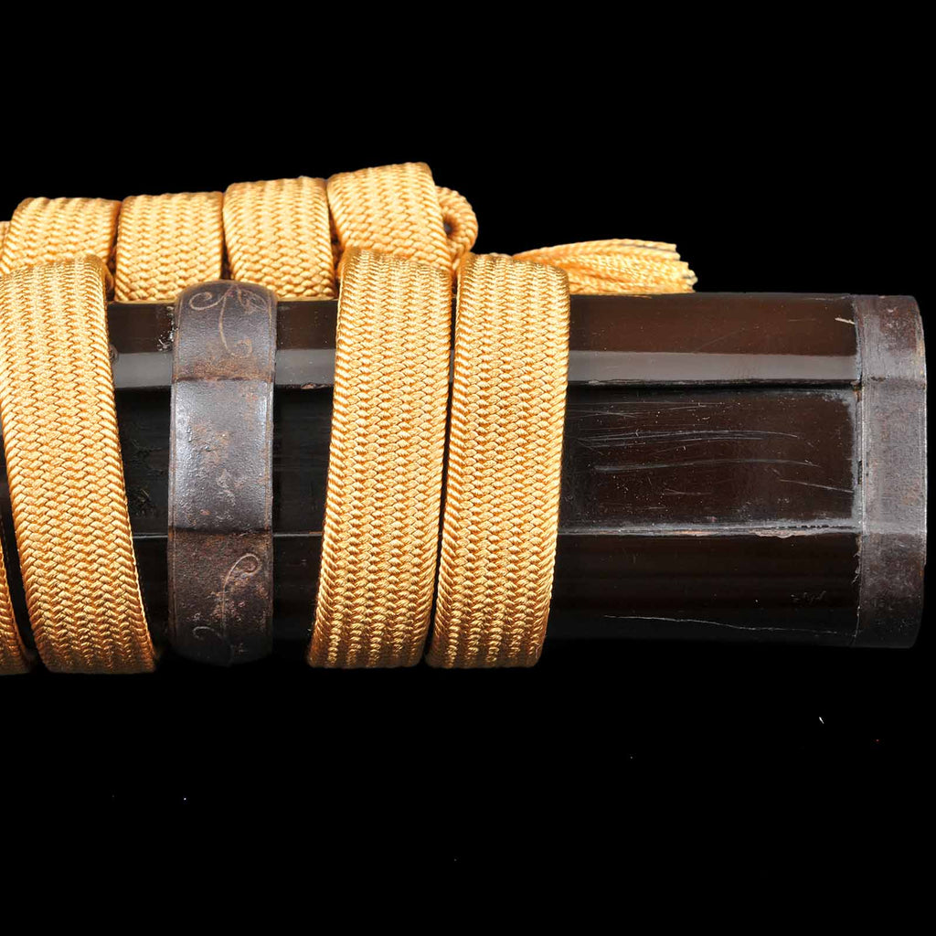 - Koshirae: Light brown silk wrapped Tsuka with black Cha-urumi lacquered Saya