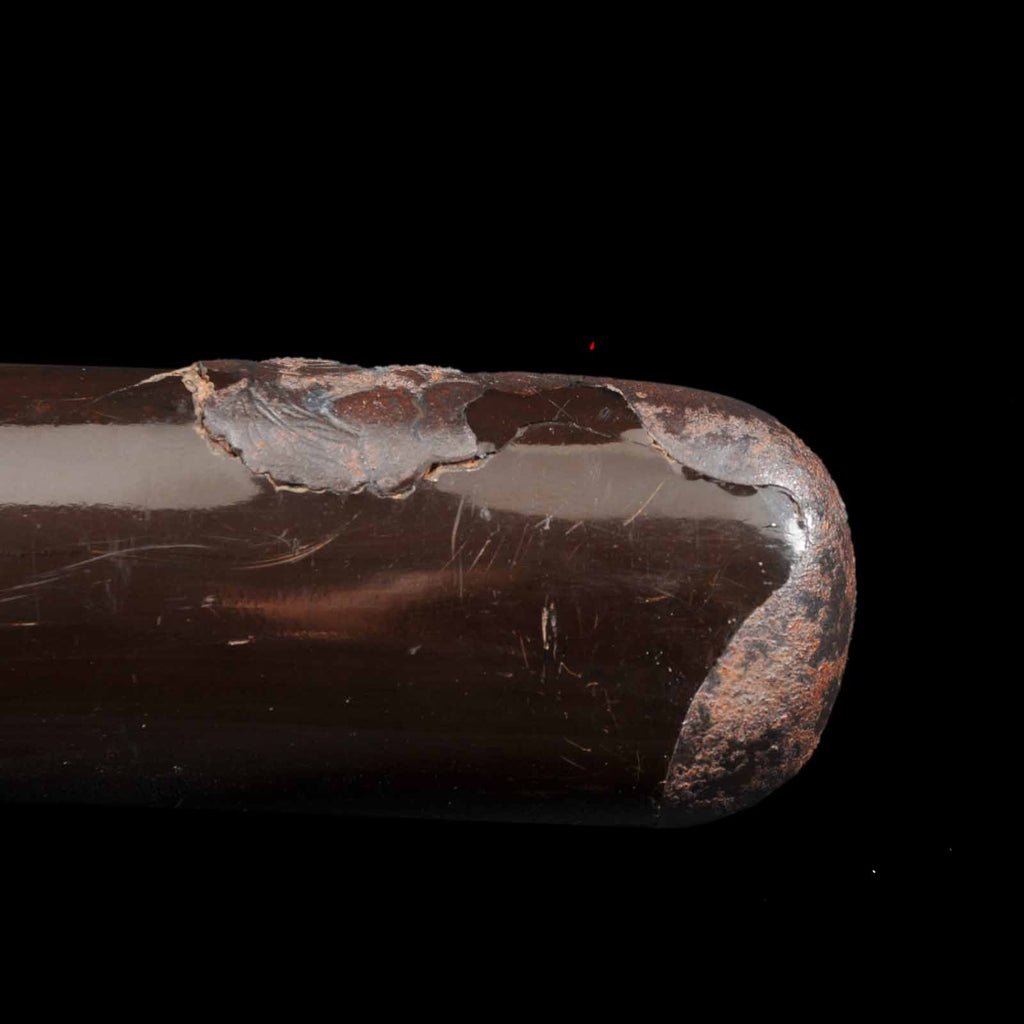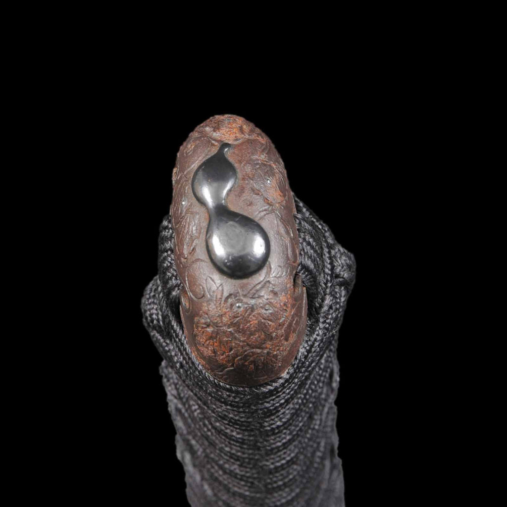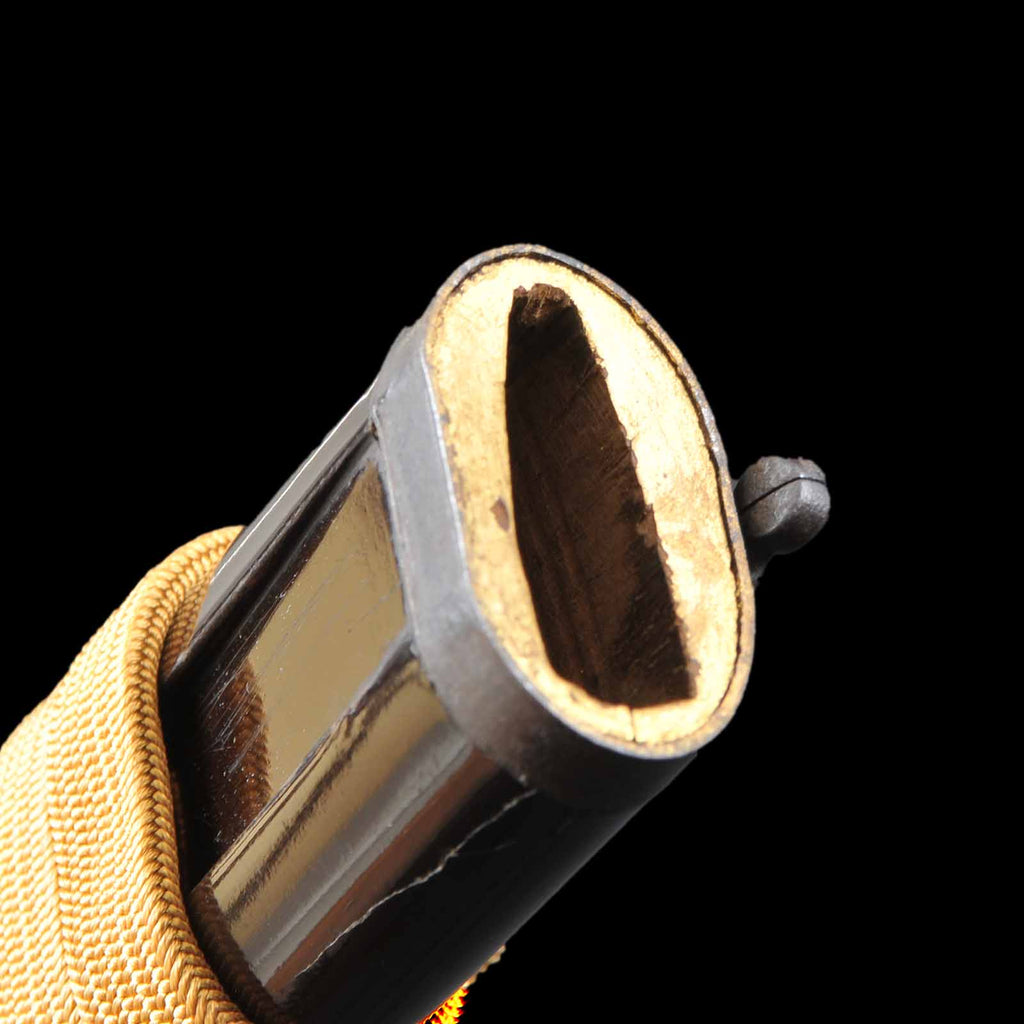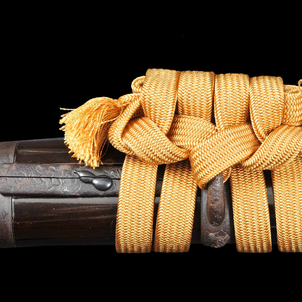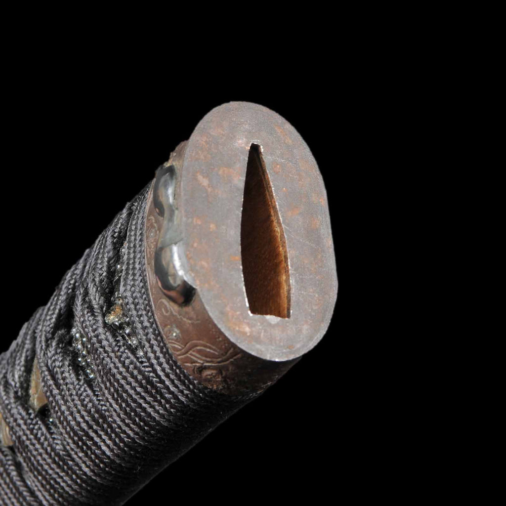 - Koshirae: Light brown silk wrapped Tsuka with black Cha-urumi lacquered Saya