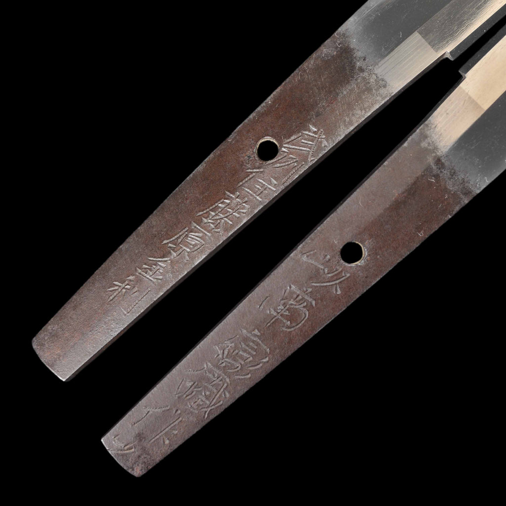 The entire blade is polished to perfection and flawless. The jigane features a well-packed, itame-patterned surface in such excellent condition it could easily be mistaken for a modern work. The hamon features a prominent, wide midare base with a prominent gnome pattern. The nioi-guchi is well defined. The nakago bears inscriptions: “Bushu Fujiwara Kanetoshi” on the sashi-mote side, and “Nanbantetsu wo motte kore wo tsukuru” on the sashi-ura side. This signifies that Fujiwara Kanetoshi, residing in Bushu, crafted this using Nanbantetsu.