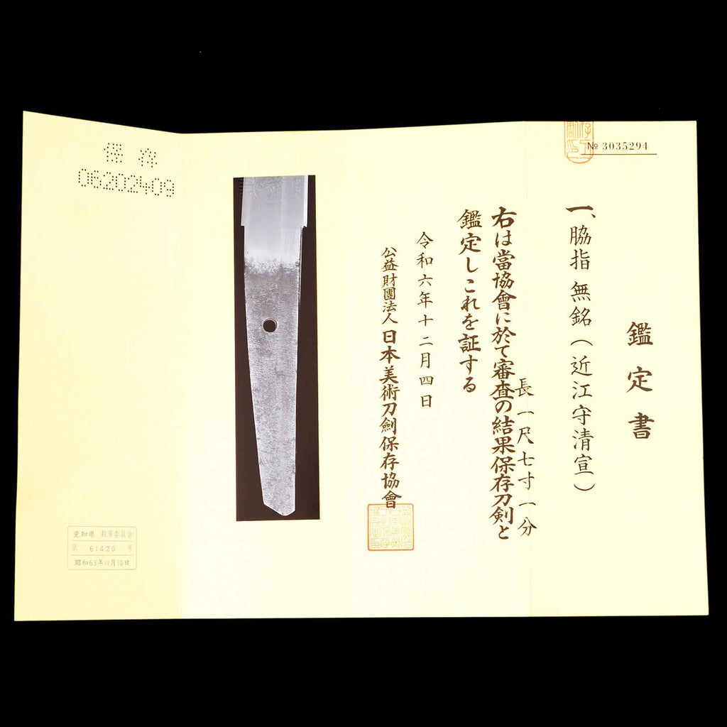 This piece is unsigned, but in December 2023, the Society for the Preservation of Japanese Art Swords issued a Hozon certificate, recognizing it as a work by Ominokami Kiyonobu and deeming it highly worthy of preservation for posterity.