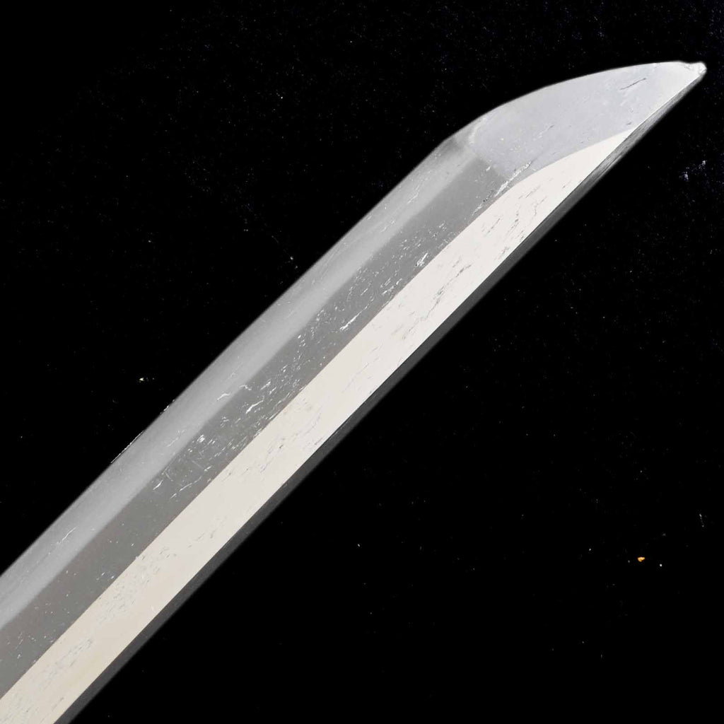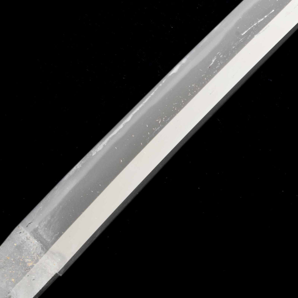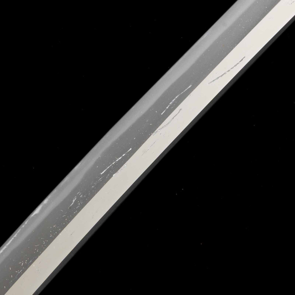 There are several deep scratches on this sword blade. Perhaps they were caused when the sword was actually used as a weapon. There is also a small dent on the cutting edge that may have been caused by poking. The curvature is shallow and the jitetsu is plain, as if the sword was made during Shinshinto period. It has a martial atmosphere like a Soshu-den sword.