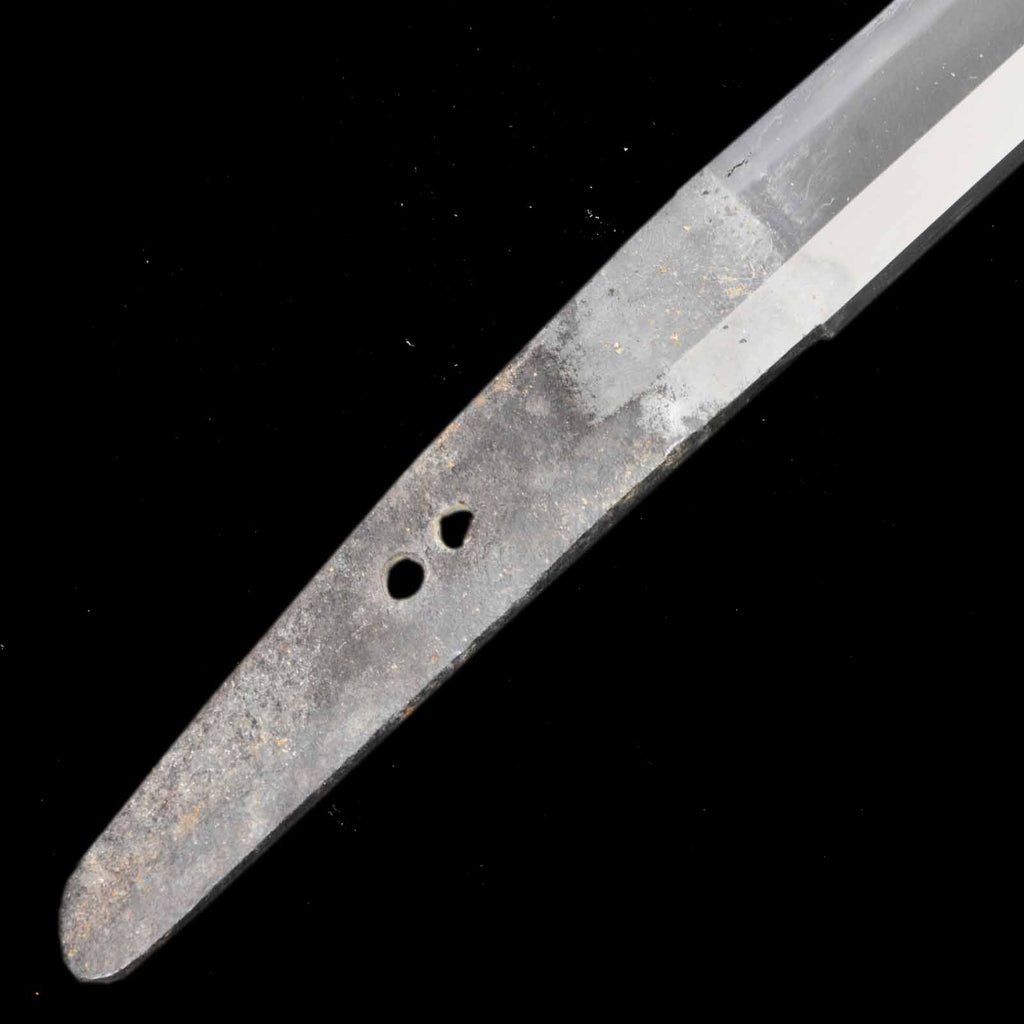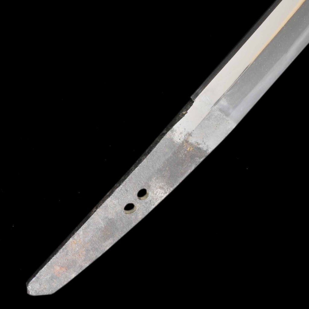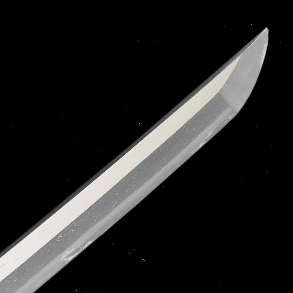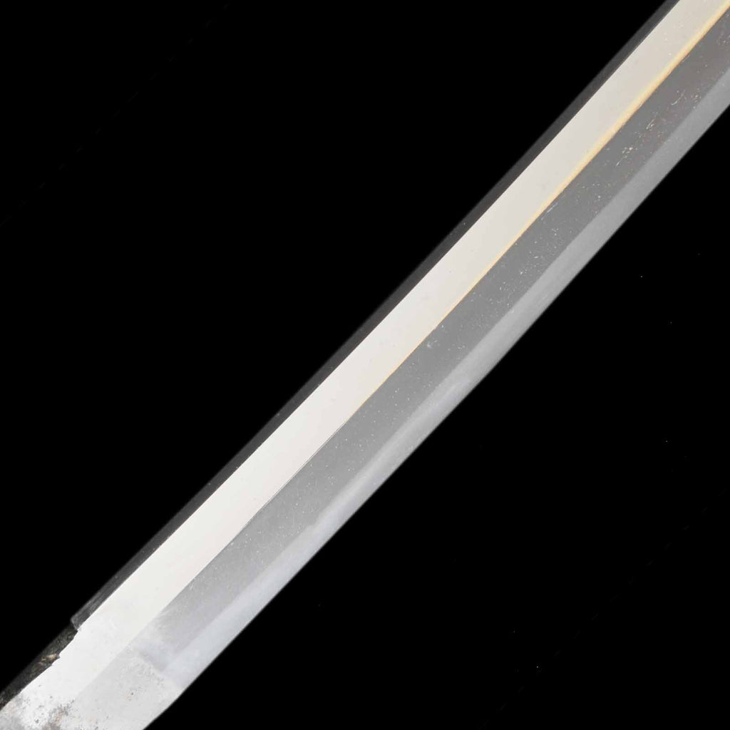 There are several deep scratches on this sword blade. Perhaps they were caused when the sword was actually used as a weapon. There is also a small dent on the cutting edge that may have been caused by poking. The curvature is shallow and the jitetsu is plain, as if the sword was made during Shinshinto period. It has a martial atmosphere like a Soshu-den sword.