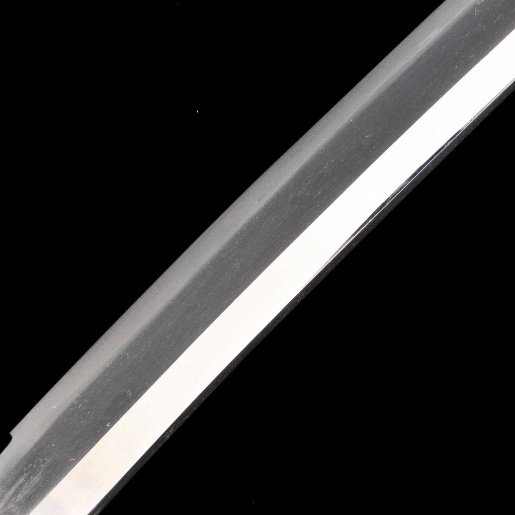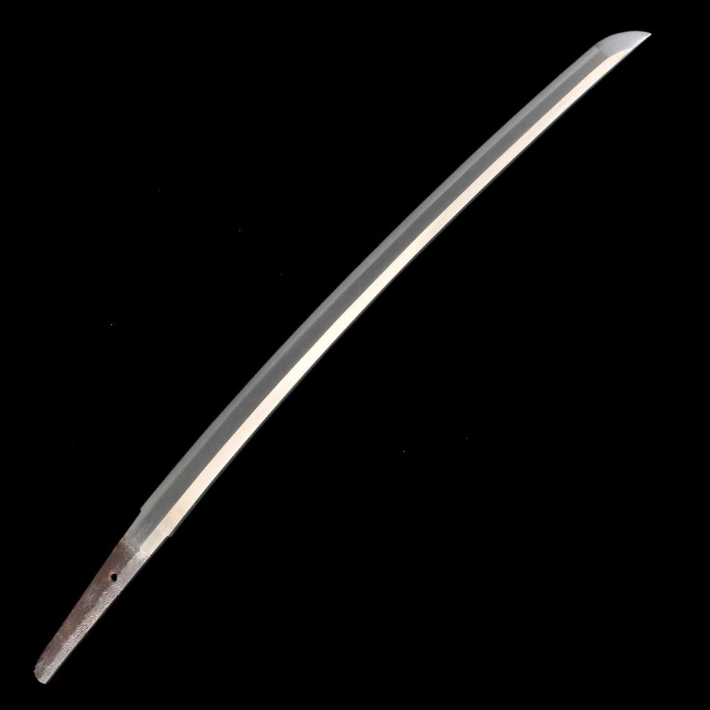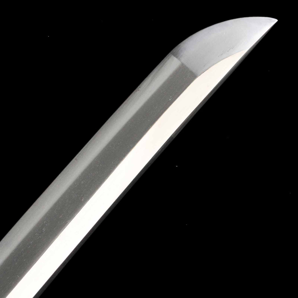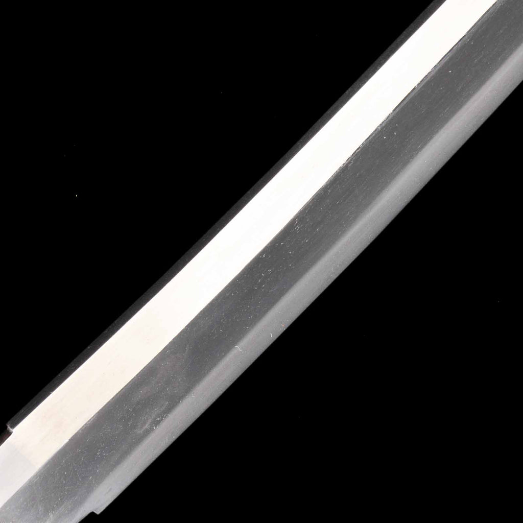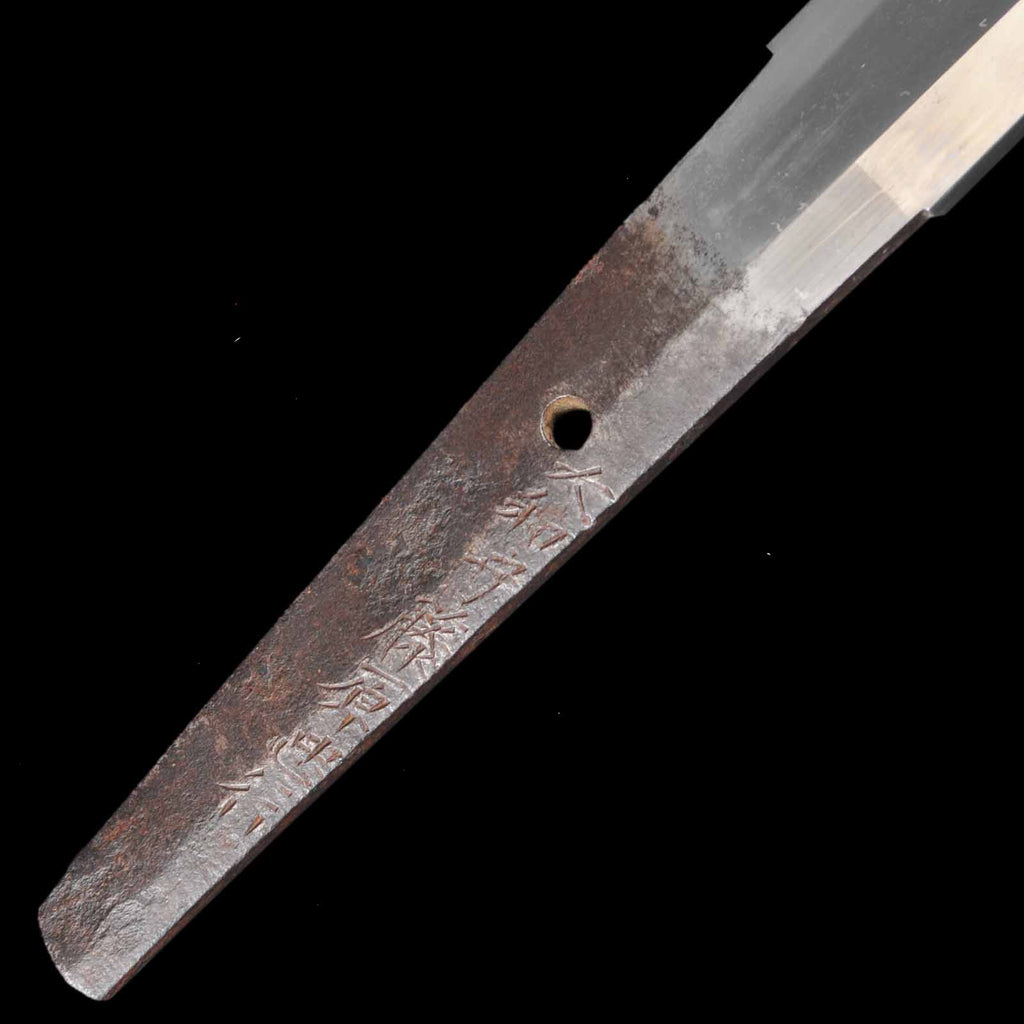 The blade is polished and almost flawless, but there is a chip on the blade about 25 cm from the hamachi, probably due to actual use. The jigane is a well-polished itame and the hamon is a slightly notare style suguha. Some hataraki, such as aranie and kinsen, can also be seen in ha. The name, Yamato no Kami Fujiwara Tadayuki is engraved on the nakago. Yamato no Kami Tadayuki was a swordsmith from the country of Bungo who was active during the Shinto period and is said to have been the son of the second Yamato no Kami Fujiwara Tadayuki. He made many works reminiscent of the master swordsman Inoue Shinkai, and was very active as the exclusive swordsmith of the Kumamoto clan in the Country of Higo.